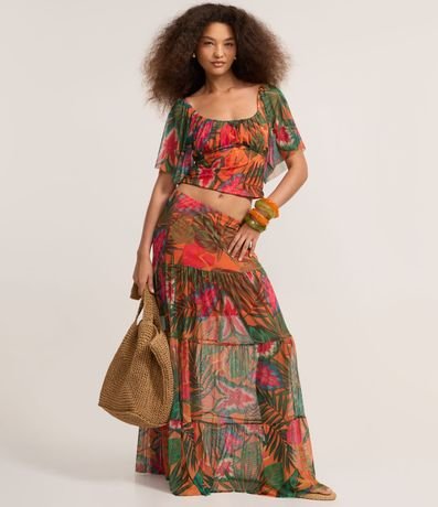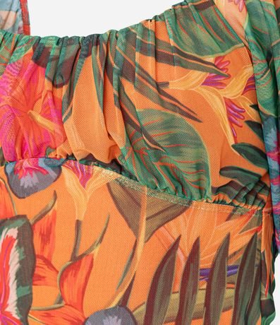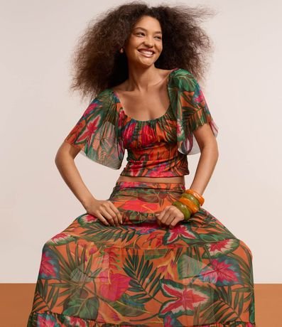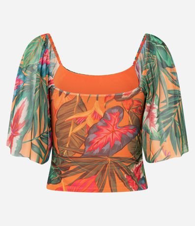Ref: Blusa cropped de mangas godês curtas, confeccionada em tule, com busto franzido e recorte abaixo. Peça com estampa de folhagens e flores.