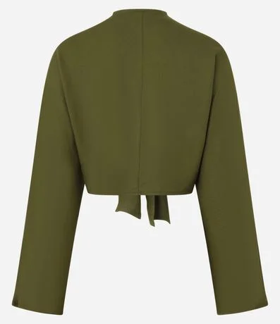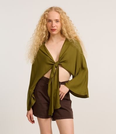 Ref: Blua cropped com manga longa ampla, confeccionada em twill com viscose certificada mais sustentável, amarração com laço no busto e produzida através de boas práticas ambientais.