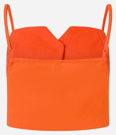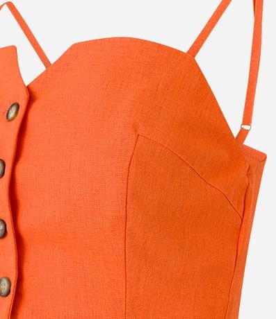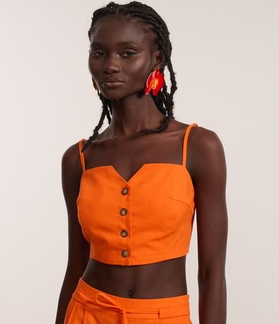Ref: Blusa cropped feminina confeccionada em viscolinho, com decote coração e alcinhas finas. Sem estampa, possui abotoamento frontal matizado.