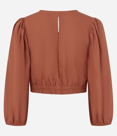 Ref: Blusa feminina super cropped com decote em v, detalhe torcido, barra ajustada e manga longa ajustada. Peça produzida em linho e viscose certificada.