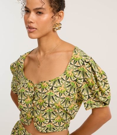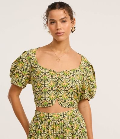 Blusa cropped com manga curta, confeccionada em viscolinho e estampa de cogumelos.