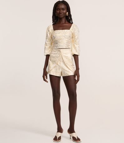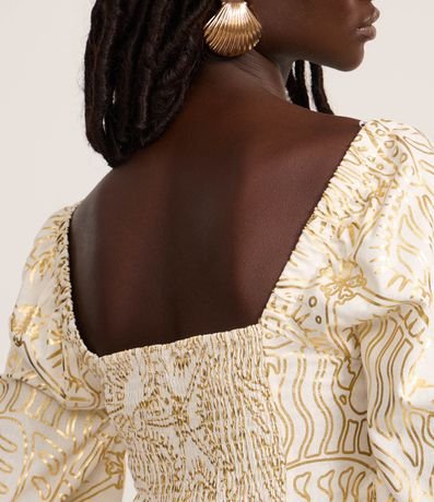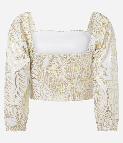 Blusa cropped de mangas 3/4, confeccionada em viscolinho com 20% de linho, com decote quadrado, elásticos nas cavas e punhos. Peça com estampa abstrata de foil. Este produto possui viscose certificada em sua composição, sendo ambientalmente mais responsável.