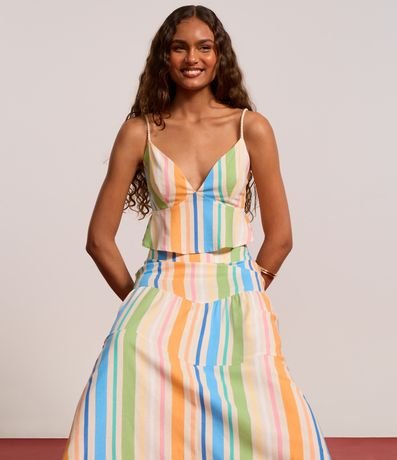 Blusa Cropped em Viscolinho com Lastex e Estampa Listrada