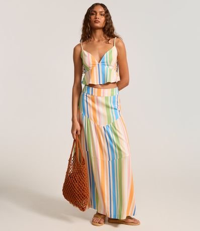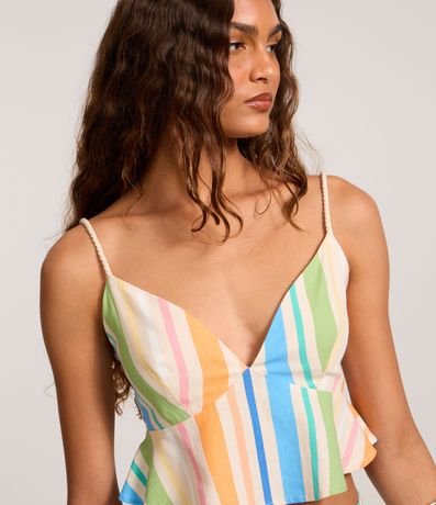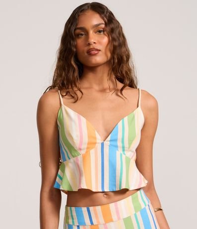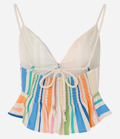 Blusa cropped com alcinha fina, confeccionada em visoclinho, amarração e lastex nas costas, listras colirdas e babado na barra.