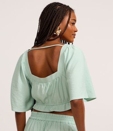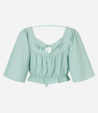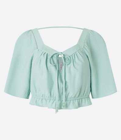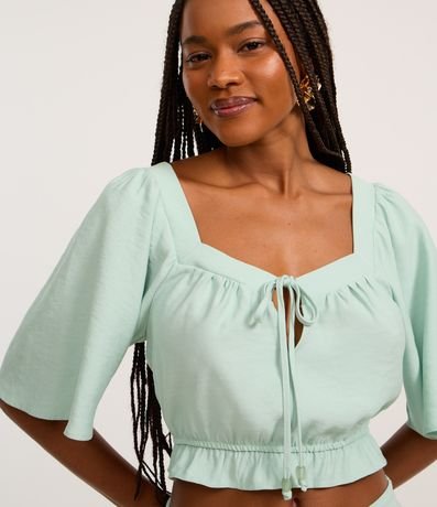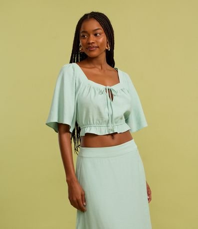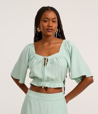 Ref: Blusa cropped com decote quadrado, manga curta godê, confeccionada em viscose certificada, amarração no busto e produzida através de boas práticas ambientais.
