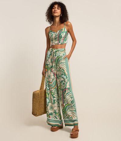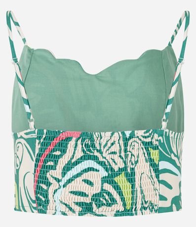 Ref: Blusa cropped, alcinhas finas, decote diferenciado com lastex nas costas e estampa de folhagens.