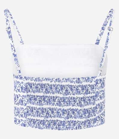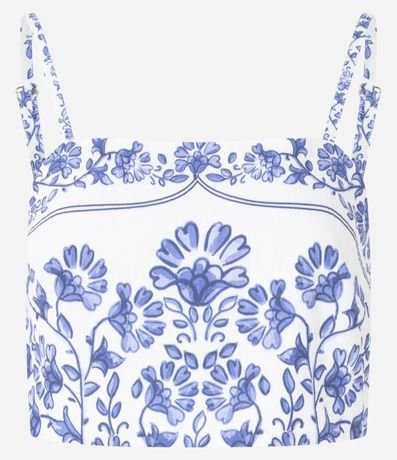Ref: Blusa cropped e sem mangas, confeccionada em viscose, com decote reto, lastex nas costas e estampa floral. As flores estampadas remetem ao estilo de ilustrações de azulejos lusitanos. Este produto possui viscose certificada em sua composição, além de ter sido produzido através de processos mais sustentáveis com boas práticas ambientais, sendo ambientalmente mais responsável.