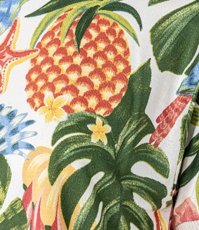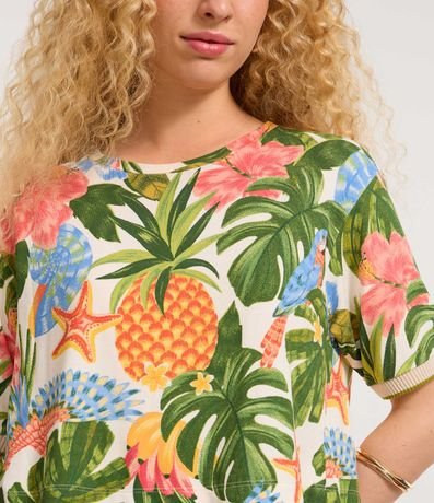 Camiseta cropped com gola redonda, mangas curtas, detalhe retilínea na barra e estampa tropical.