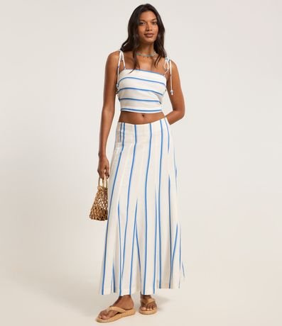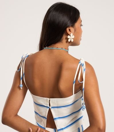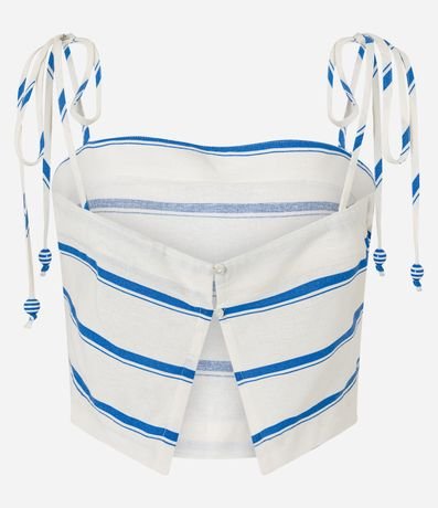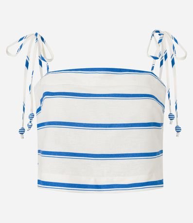 Ref: Cropped de alcinhas finas, confeccionado em viscose certificada mais sustentável, amarração com miçanga nas alças e estampa em listras.