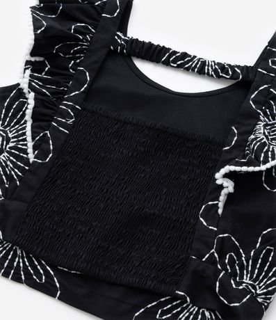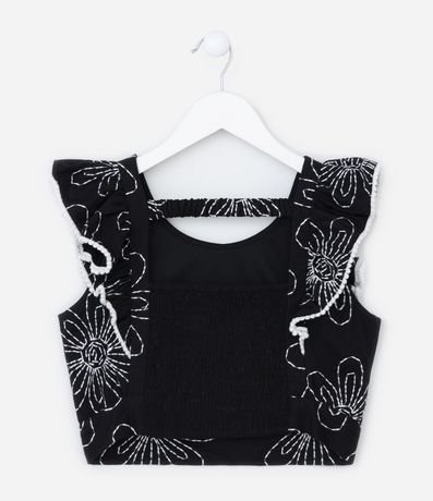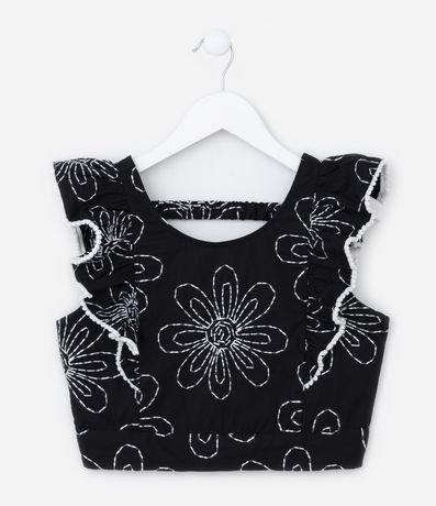 Ref: Blusa infantil de modelo cropped, confeccionada em crepe. Possui gola redonda, sem mangas, com babado nas cavas, bordado de margaridas e elástico nas costas para maior conforto.