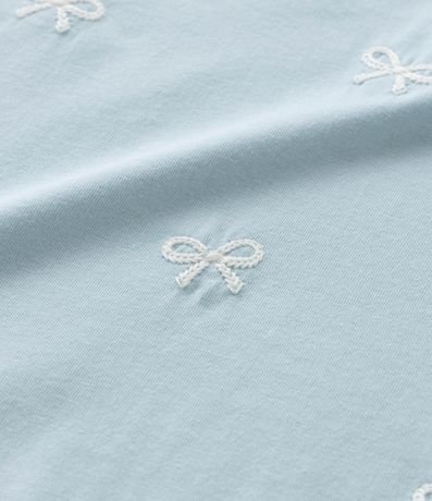 Blusa cropped infantil confeccionada em algodão de material e processo mais sustentáveis. Possui gola redonda, manga curta e bordado de lacinhos na frontal.