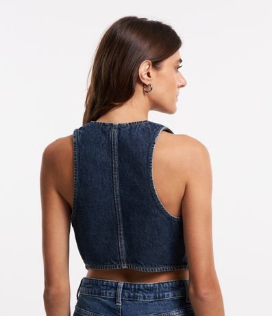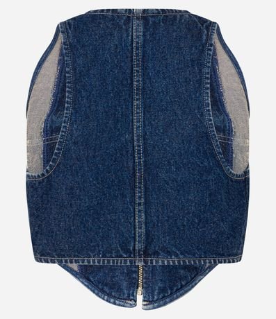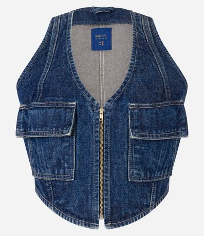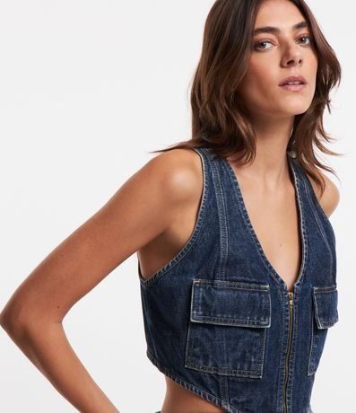 Ref: Blusa cropped sem mangas confeccionada em jeans com bolsos cargo no peito e fechamento frontal por zíper.