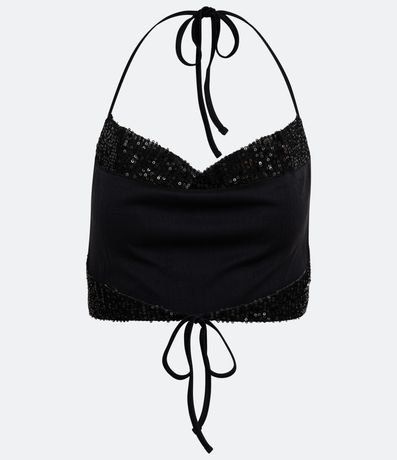 Blusa cropped sem manga em malha paetê com amarração no pescoço e nas costas.