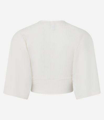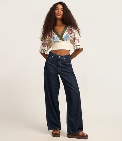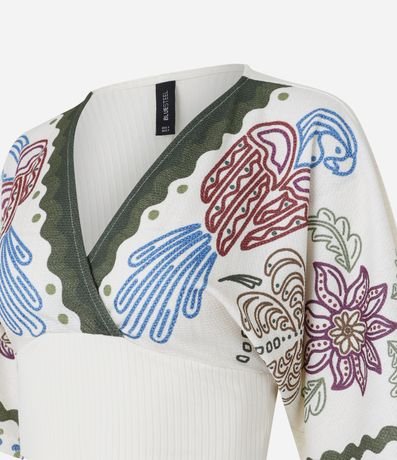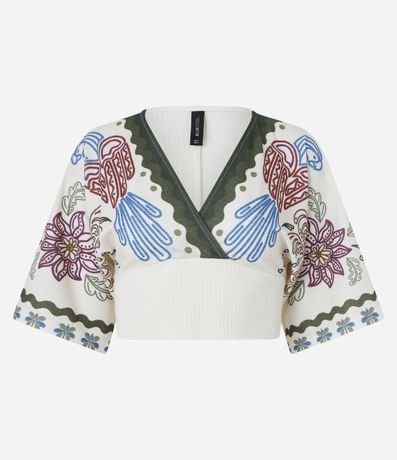 Ref: Blusa cropped texturizada, decote v transpassado e com estampa frontal de araras coloridas.