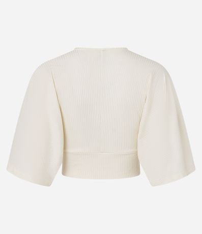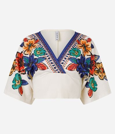 Ref: Blusa cropped texturizada, decote v transpassado e com estampa frontal de flores coloridas.