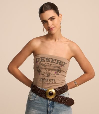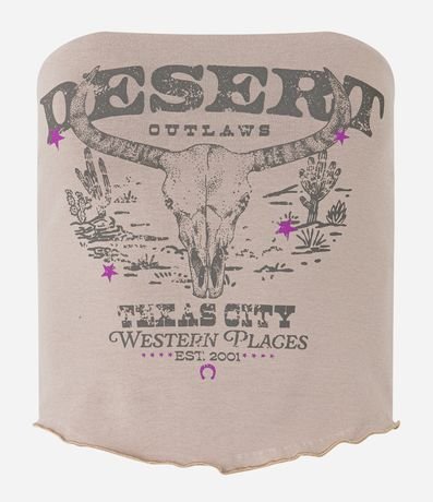 Ref: Blusa feminina de modelo cropped, tomara que caia, com barra frontal em V, confeccionada em malha de algodão mais responsável e com estampa frontal de deserto, com lettering "texas city".