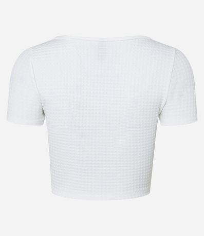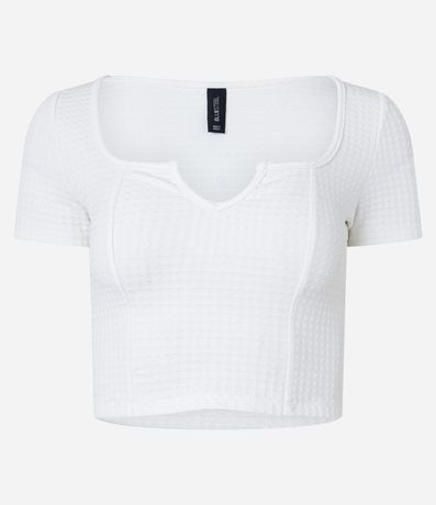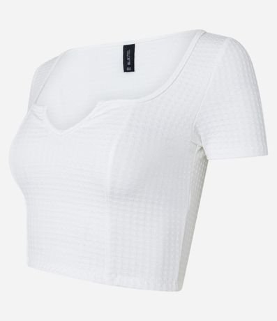 Ref: Blusinha curta com textura vichy, decote com recorte v, mangas curtas e sem estampa.