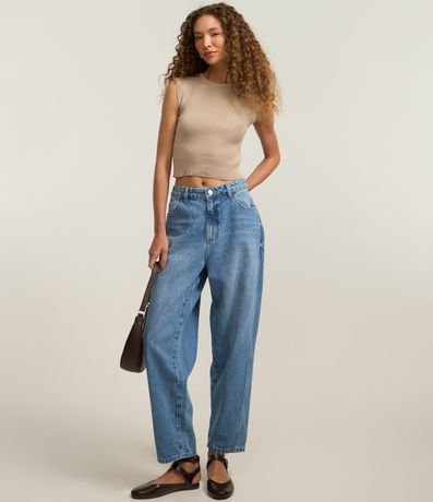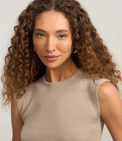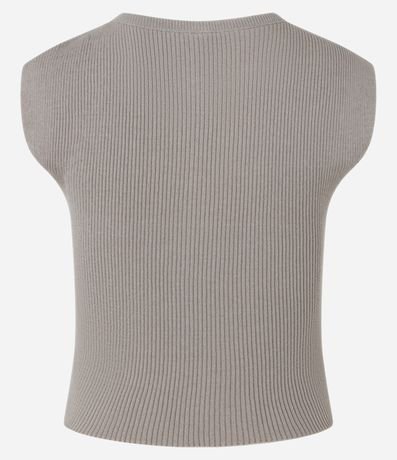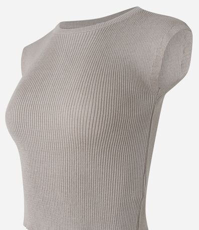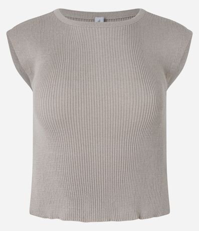 Blusa feminina confeccionada em tricô leve, de comprimento curto, com gola redonda e sem mangas. Possui textura canelada e ombros alongados.