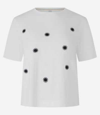 Ref: Blusa curta, t-shirt com manga curta, confeccionada em algodão mais sustentável e bordados de solzinhos.