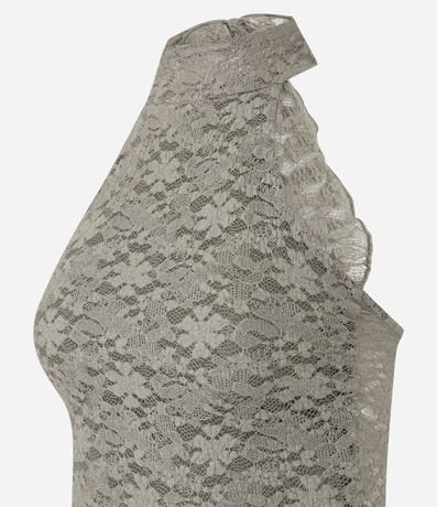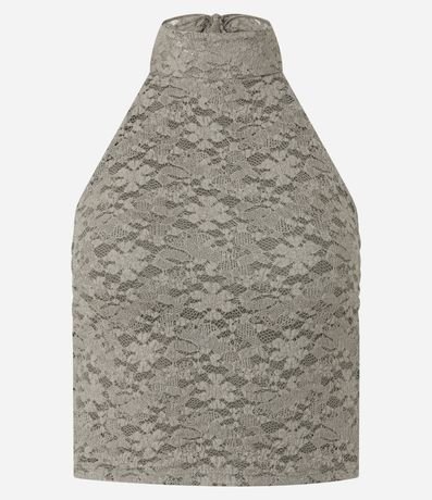 Blusa feminina confeccionada em laise, no modelo curto. Possui decote halter, com amarração no pescoço, sem mangas e textura floral.
