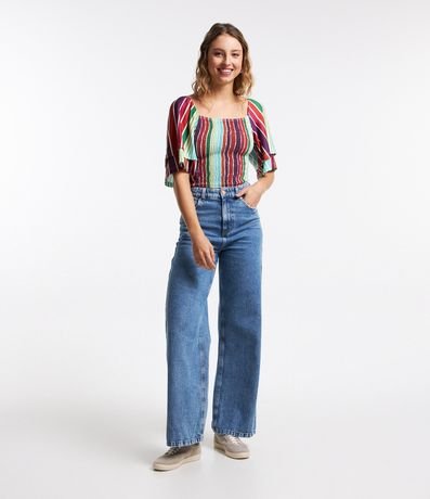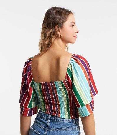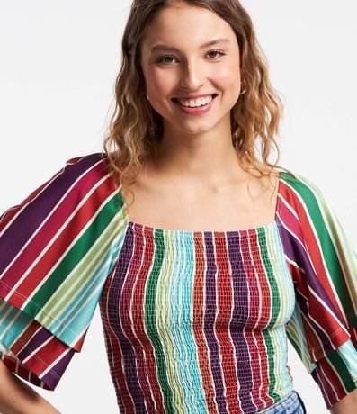 Ref: Blusa feminina de modelo curto, com decote quadrado e mangas curtas godê. Possui corpo em lastex e estampa de listras.
