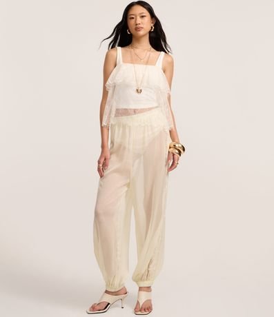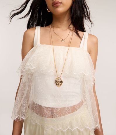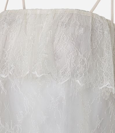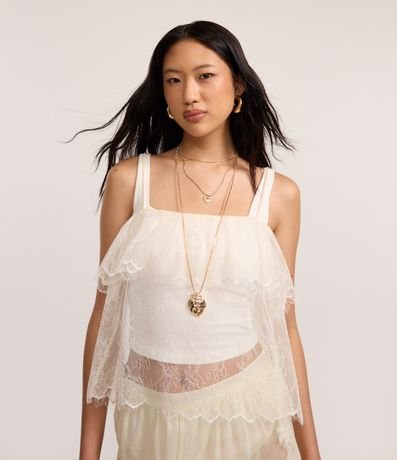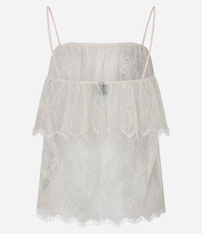 Blusa feminina confeccionada em renda, modelo curta com decote ombro a ombro, alças finas e sobreposição.