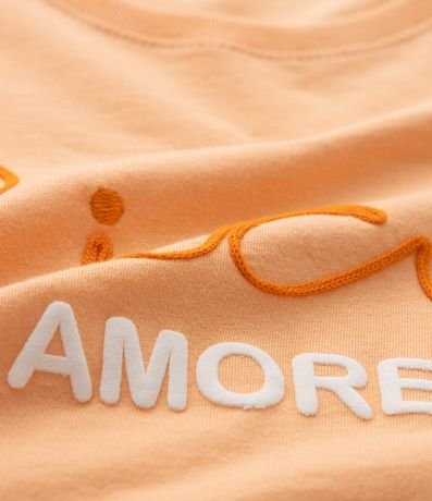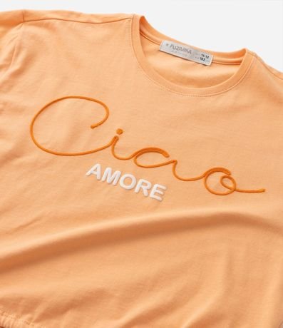 Ref: Blusa infantil curta, confeccionada em algodão com gola redonda, mangas curtas e lettering bordado "Ciao", possui também ajuste na barra.