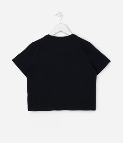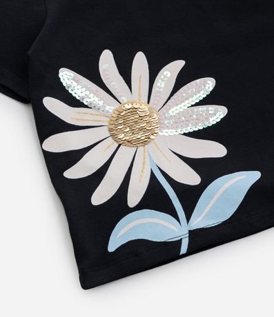 Ref: Blusa infantil curta confeccionada em algodão, com gola redonda, mangas curtas e estampa de margarida com bordado em paetês.