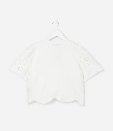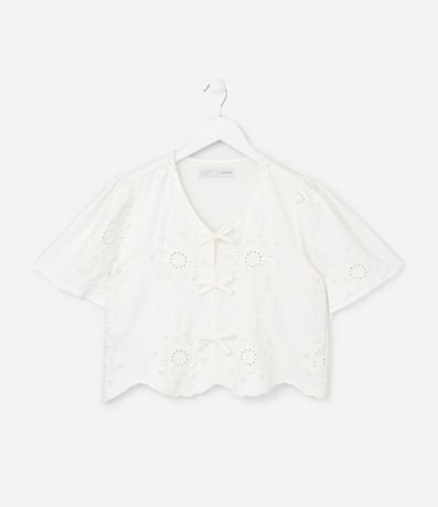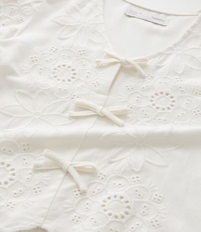 Ref: Blusa infantil confeccionada em viscose e linho, modelinho curta, com gola V, manga curta, lacinhos aplicados na frontal e bordado em borderie, super delicada!