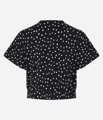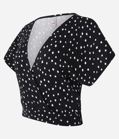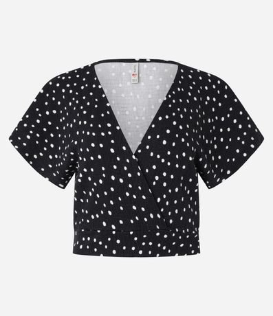 Ref: Blusa feminina curta, com textura, decote transpassado, mangas curtas e estampa poá.