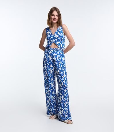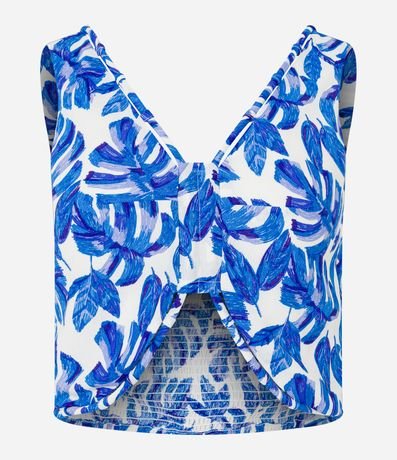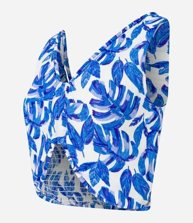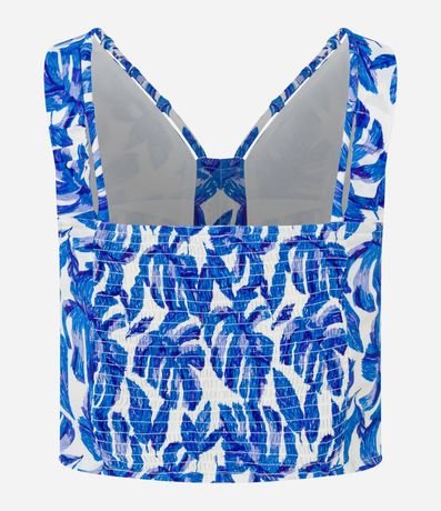 Blusa cropped com alças largas, decote V com cordas encapadas, lastex nas costas e estampa de folhagens.