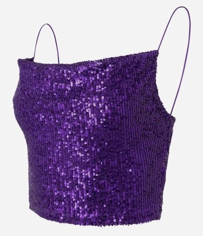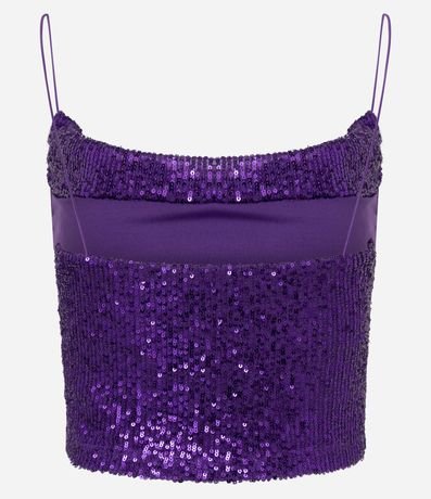 Blusa cropped com alcinhas finas, decote degagê, confeccionada em paetê metalizado.