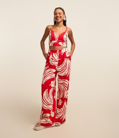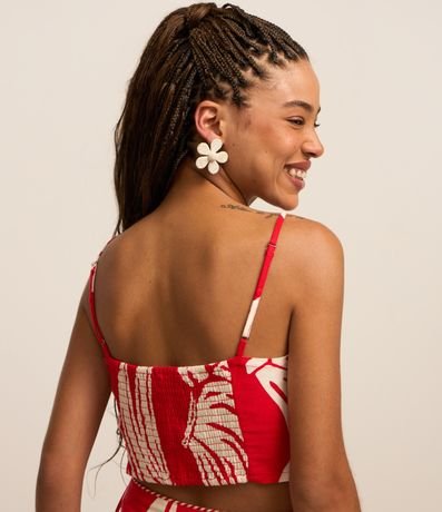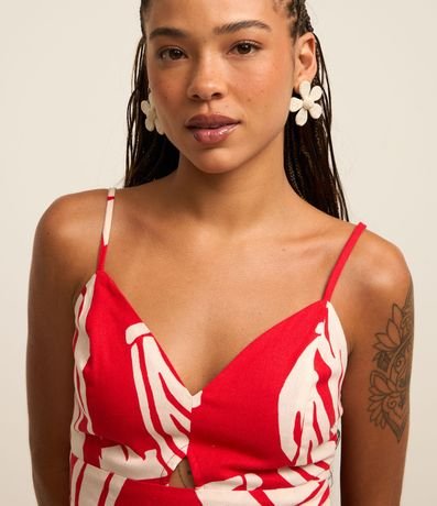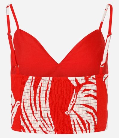 Ref: Blusa cropped com recorte vazado no busto, alcinha fina regulável, lastex nas costas e estampa de frutinhas, bananas.