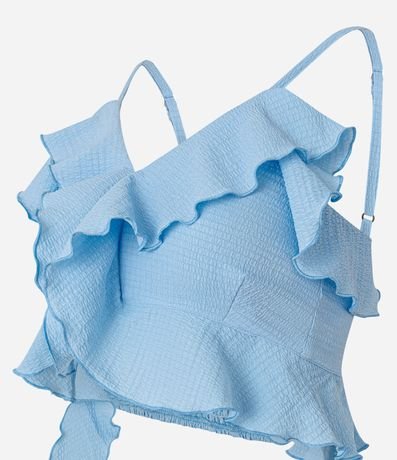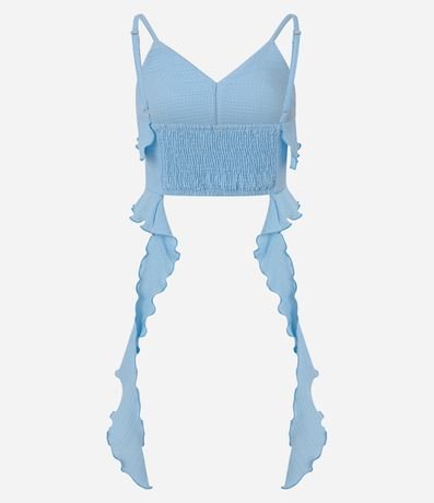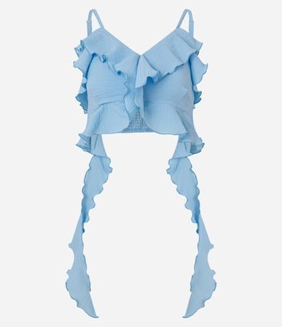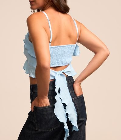 Ref: Blusa cropped com alcinhas reguláveis, babado frontal, texturizada, lastex e amarração nas costas.