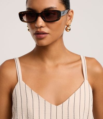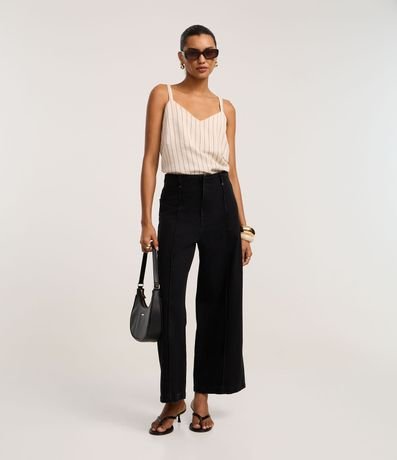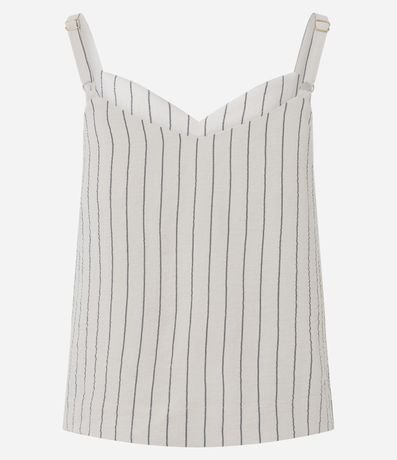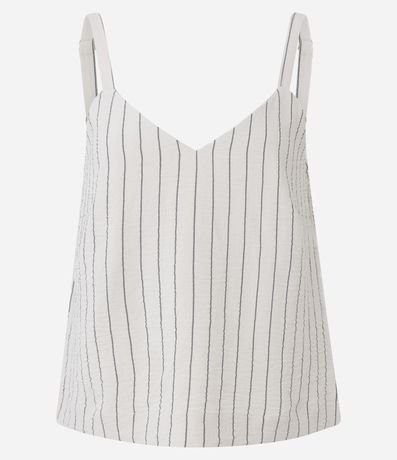 Ref: Blusa sem mangas, confeccionada em airflow, com decote V e listras verticais de fios tintos. Este produto possui material mais sustentável em sua composição, sendo ambientalmente mais responsável.