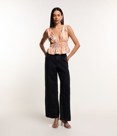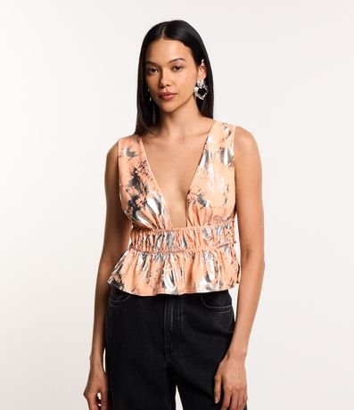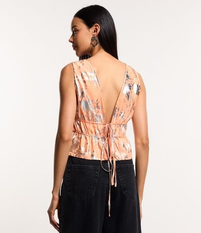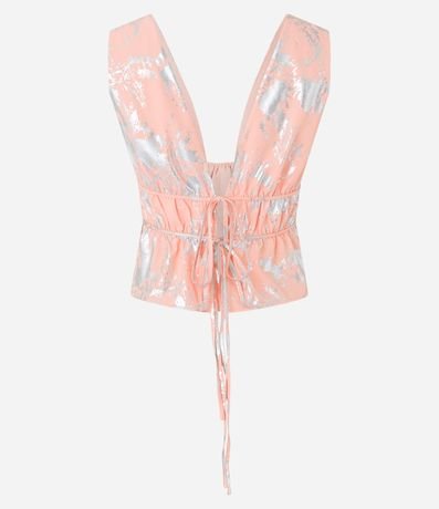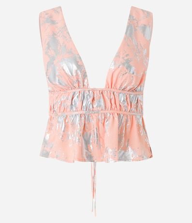 Blusa de alças largas, decote v com franzido frontal, detalhes em foil e amarração nas costas.