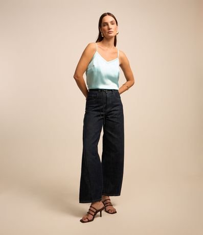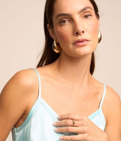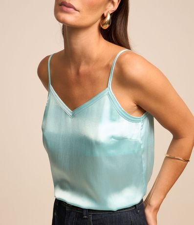 Blusa sem mangas confeccionada em tecido acetinado com decote V e alcinhas finas.