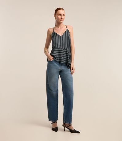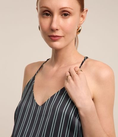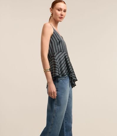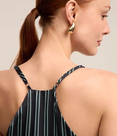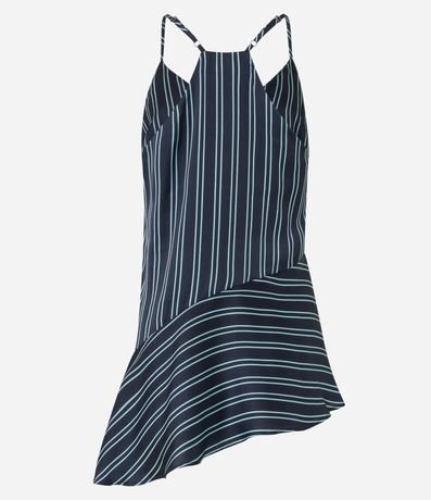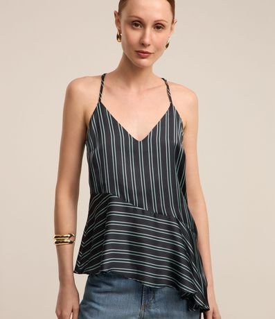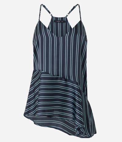 Ref: Blusa sem mangas confeccionada em tecido acetinado com alcinhas finas reguláveis além de listras contrastantes e barra assimétrica.