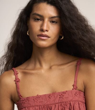 Ref: Blusa com alça fina em tricoline com babados e bordado floral.