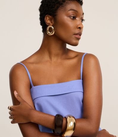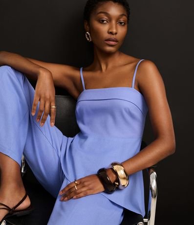 Blusa sem mangas, confeccionada em viscolinho, com decote reto com pala dobrada, alças finas, fechamento nas costas por zíper e barra assimétrica. Este produto possui viscose certificada em sua composição, sendo ambientalmente mais responsável.