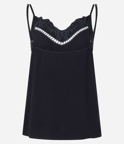 Blusa de alcinha regulável, decote v com bordado foral e detalhes vazadinhos no busto.