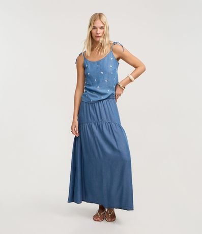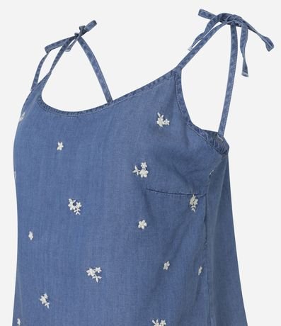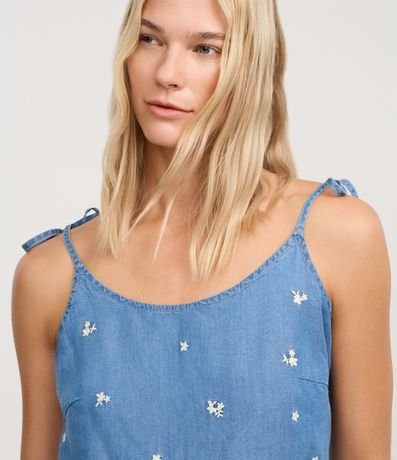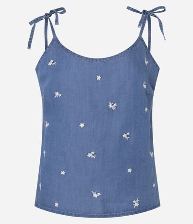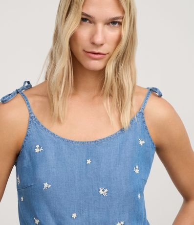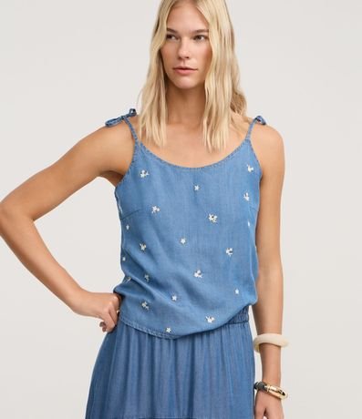 Ref: Blusa sem mangas, confeccionada em liocel, com alças finas de laços, e bordados de flores. Este produto possui algodão certificado BCI em sua composição, além de ter sido produzido através de processos mais sustentáveis, sendo ambientalmente mais responsável.