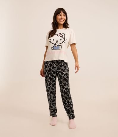 Ref: Blusa de pijama feminina confeccionada em poliéster, com gola redonda, mangas curtas e estampa da Hello Kitty.