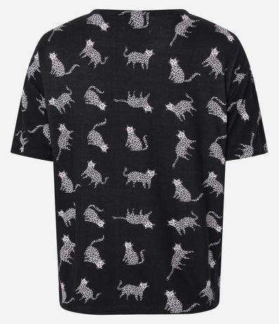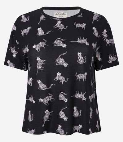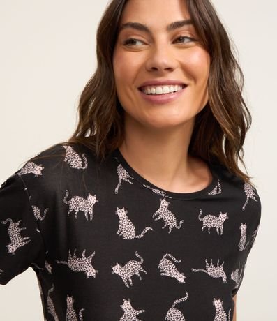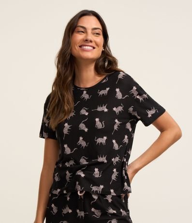 Ref: Blusa de pijama confeccionada em poliéster com elastano, com gola redondo e mangas curtas além de estampa de gatinhos com pelagem de animal print de onça. Possui toque suave, Peça avulsa.
