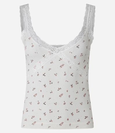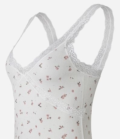 Ref: Peça avulsa de pijama confeccionada em poliamida com acabamento seamless. A blusa tem alças fixas, decote V, estampa floral delicada e aplicação de renda em X.