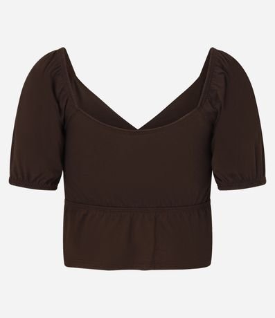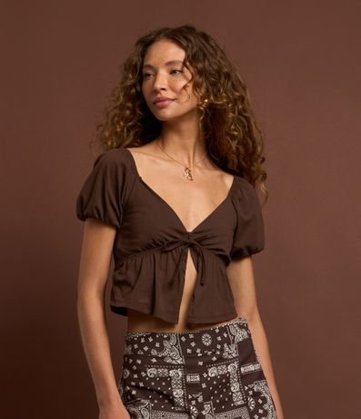 Ref: Blusa manga curta, com decote v e amarração, abertura frontal com franzidinhos.