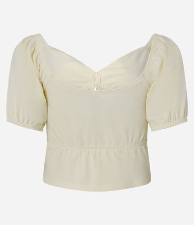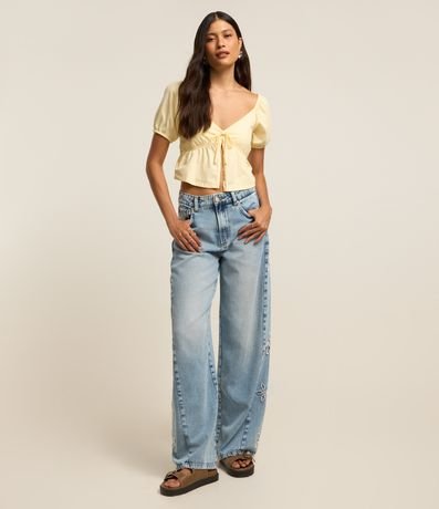 Ref: Blusa manga curta, com decote v e amarração, abertura frontal com franzidinhos.