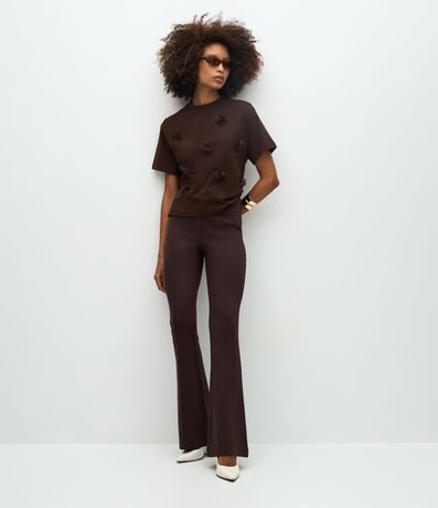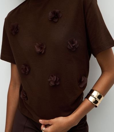 Ref: Blusa feminina confeccionada em algodão mais sustentável. Possui modelagem reta, manga curta, aplicações de flores em relevo distribuídas pela parte frontal, criando textura delicada. Conta com gola média canelada e acabamento simples na barra e nas mangas.