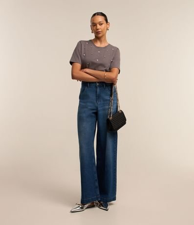 Ref: Blusa feminina, confeccionada em algodão, com gola redonda, mangas curtas e aplicação de strass.