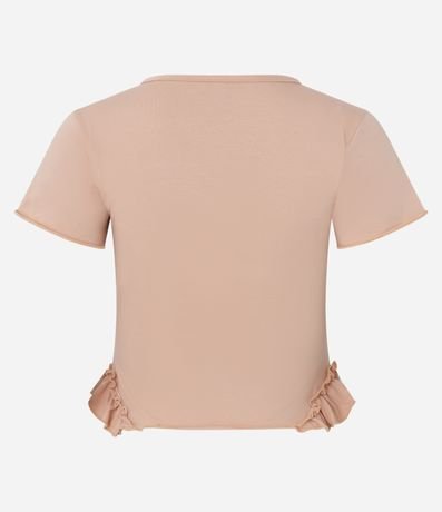 Ref: Blusa de mangas curtas, confeccionada em algodão, com gola redonda e babados nas laterais da barra. Estampada com ilustração de praia e lettering "Brisa do Mar - Sol Em Quaresma".